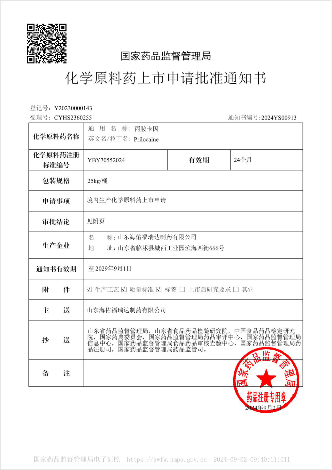公司于2023年3月向國家藥品監(jiān)督管理局藥品審評中心(以下簡稱“CDE”)提交丙胺卡因原料藥的上市申請資料,經(jīng)CDE的專業(yè)審評,順利于2024年9月取得丙胺卡因化學(xué)原料藥上市申請批準(zhǔn)通知書。