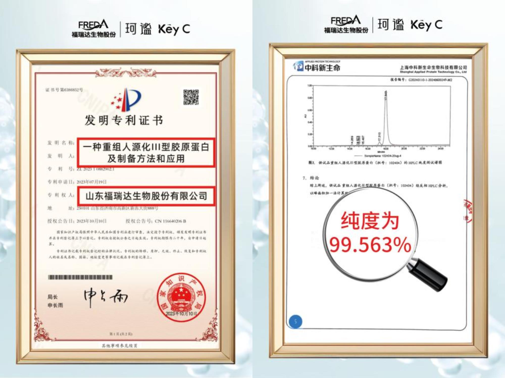 截止目前,福瑞達在重組膠原蛋白領(lǐng)域已構(gòu)建起從原料、研發(fā)、生產(chǎn)到品牌運營的全產(chǎn)業(yè)生態(tài),技術(shù)壁壘與產(chǎn)業(yè)協(xié)同能力在行業(yè)獨樹一幟。在原料端,2024年,成功完成醫(yī)用級重組Ⅲ型人源化膠原蛋白原材料主文檔登記,正式踏入醫(yī)療器械高標(biāo)準(zhǔn)賽道。投資上億元建成的膠原蛋白醫(yī)療器械智能化生產(chǎn)基地,是山東省首個重組膠原蛋白原料量產(chǎn)基地。依托福瑞達“妝藥同源”協(xié)同創(chuàng)新優(yōu)勢,珂謐KeyC已儲備多項專利技術(shù),為產(chǎn)品的持續(xù)迭代提供了堅實支撐。